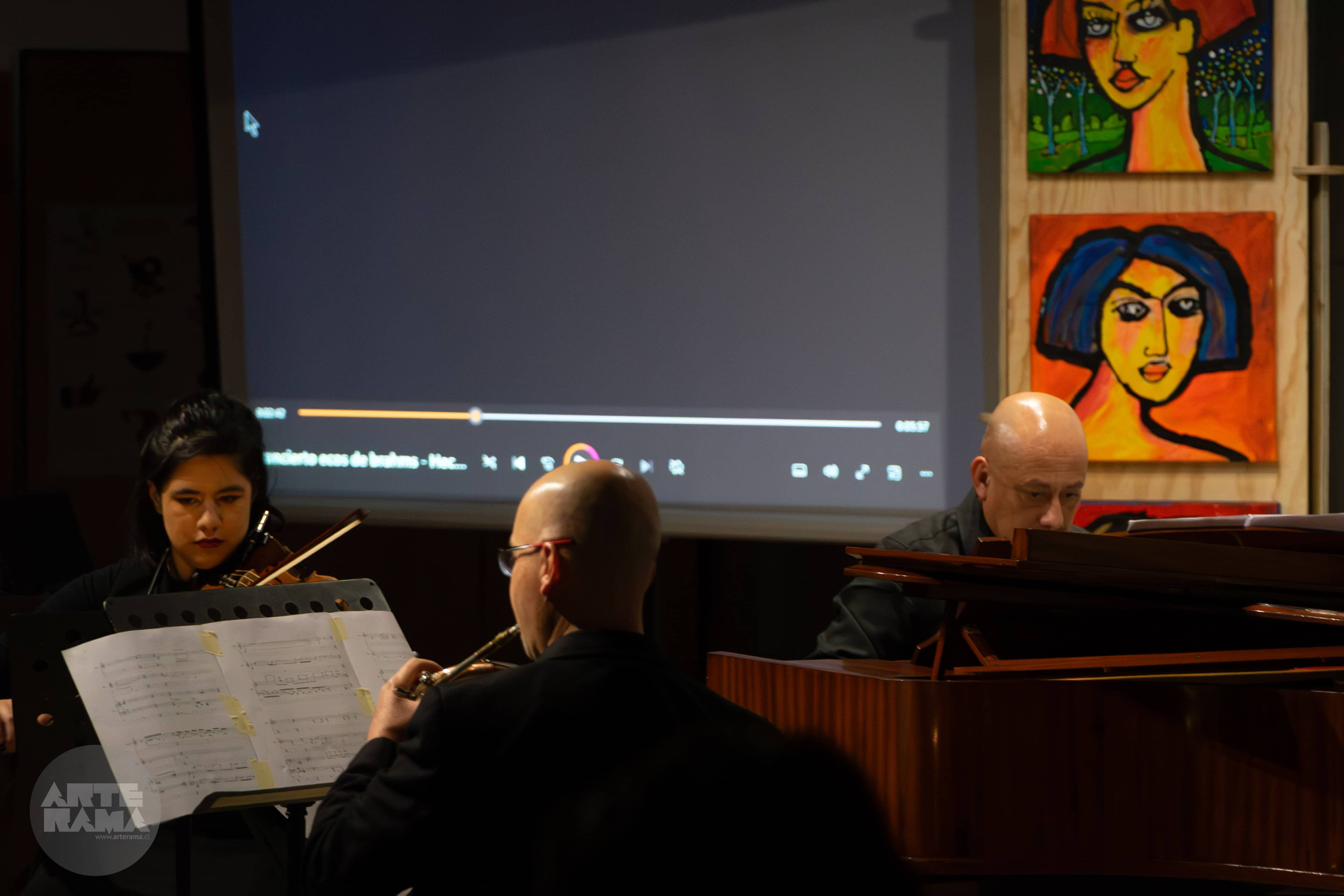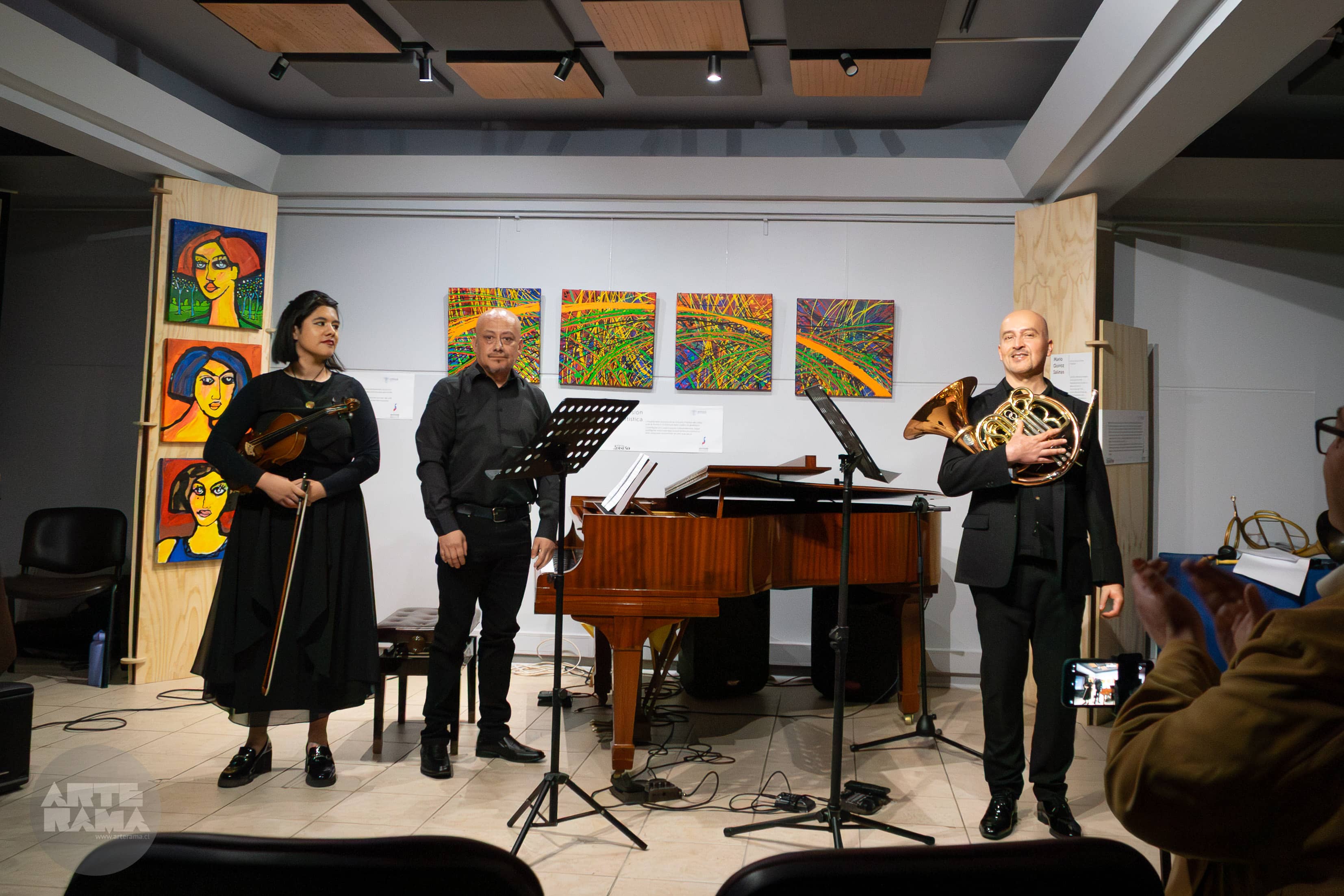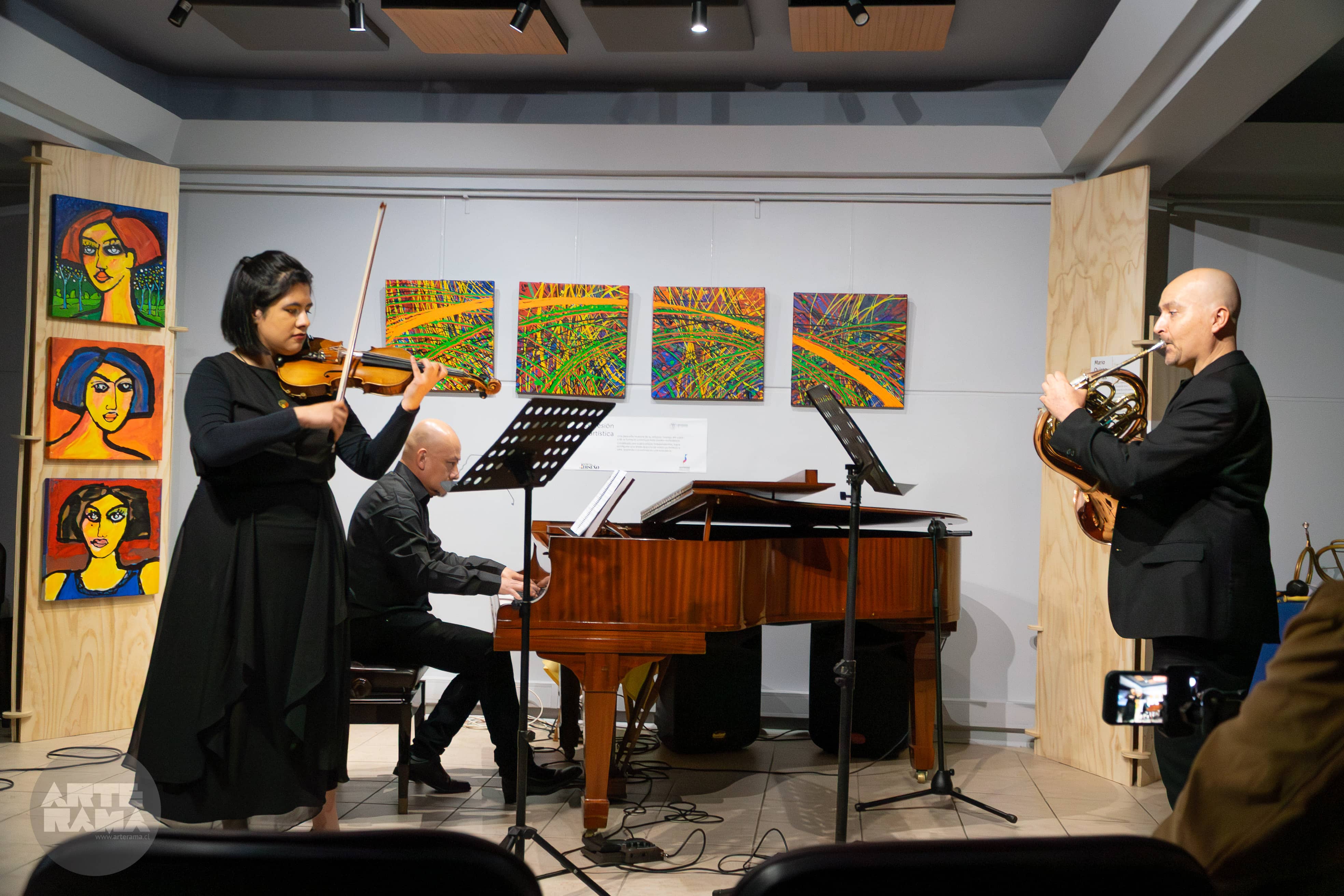 El concierto contó con la participación de la violinista Andrea Larraguibel, el cornista Alejandro Meléndez y el pianista Julio Torres. El programa comenzó con la obra Los Andes, una composición de Alejandro Meléndez Pino que nos transportó por paisajes sonoros a través de una rica variedad de instrumentos de viento. Destacaron el corno moderno y el corno natural, acompañados por flautas y recursos tecnológicos que, en conjunto, crearon