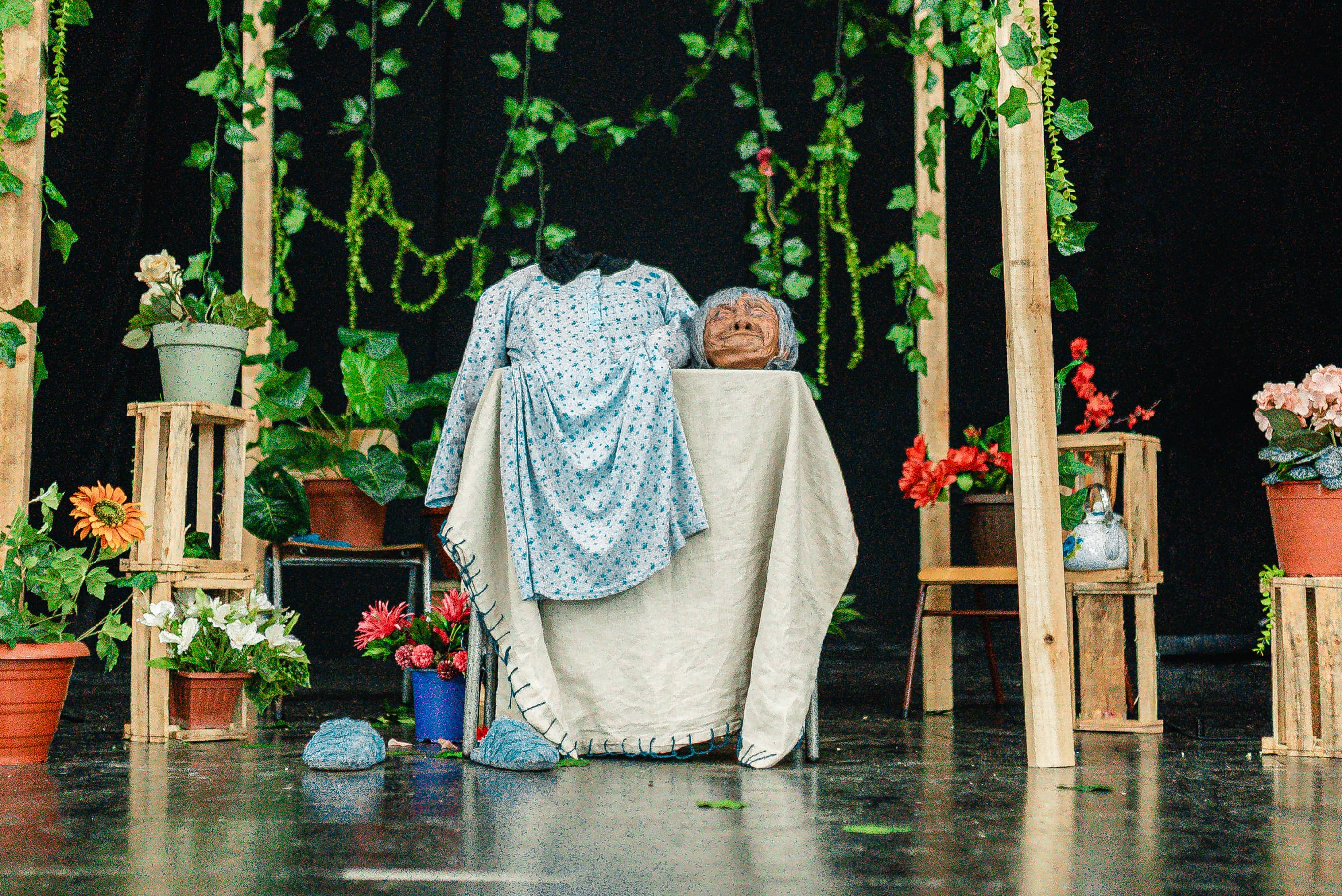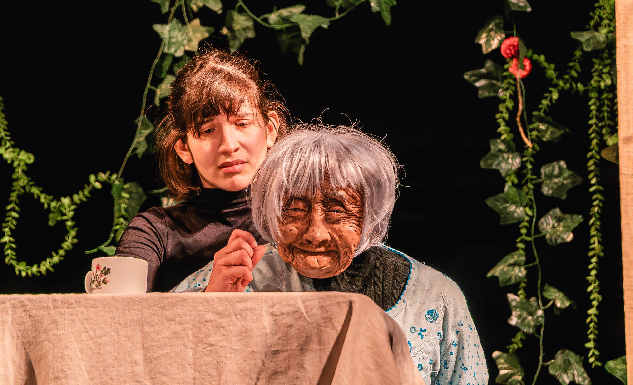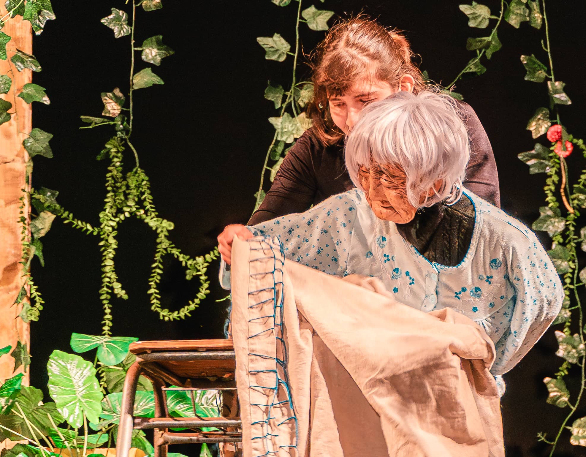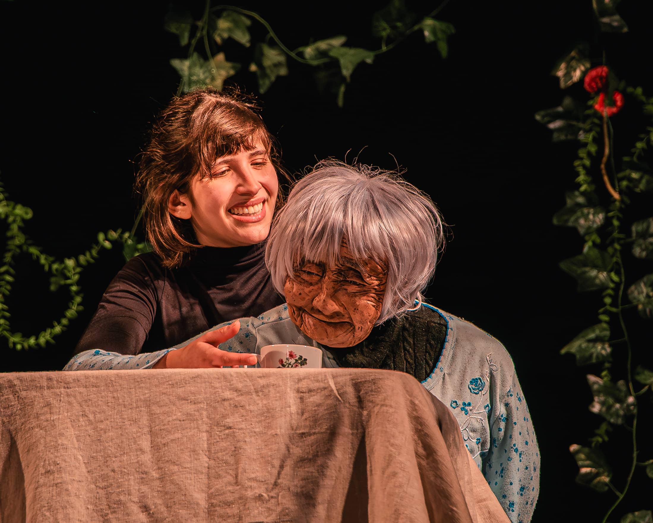 La puesta en escena destaca por una escenografía sencilla pero cuidadosamente elaborada. La obra cuenta con una sola actriz, quien interpreta a ambos personajes: la nieta y, mediante una marioneta, a la abuela. Este recurso escénico potencia la intimidad del relato y permite una conexión profunda con el público.