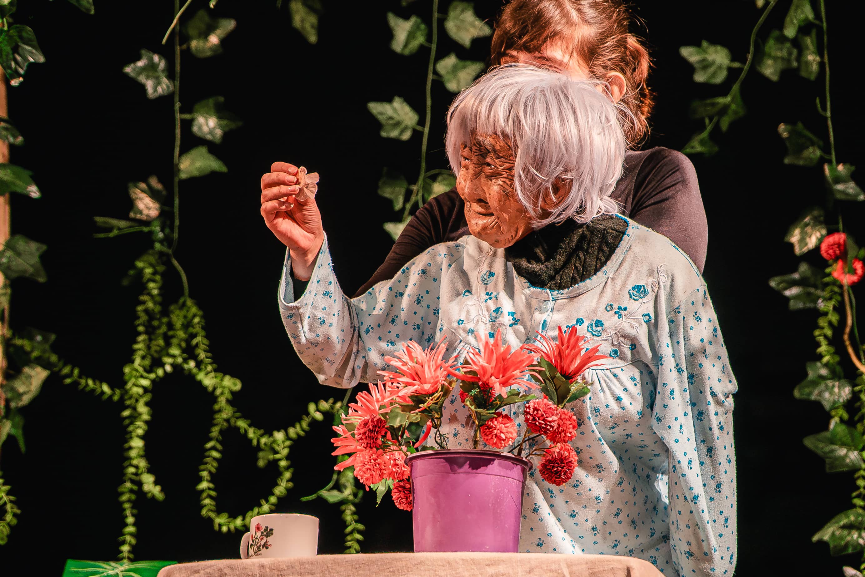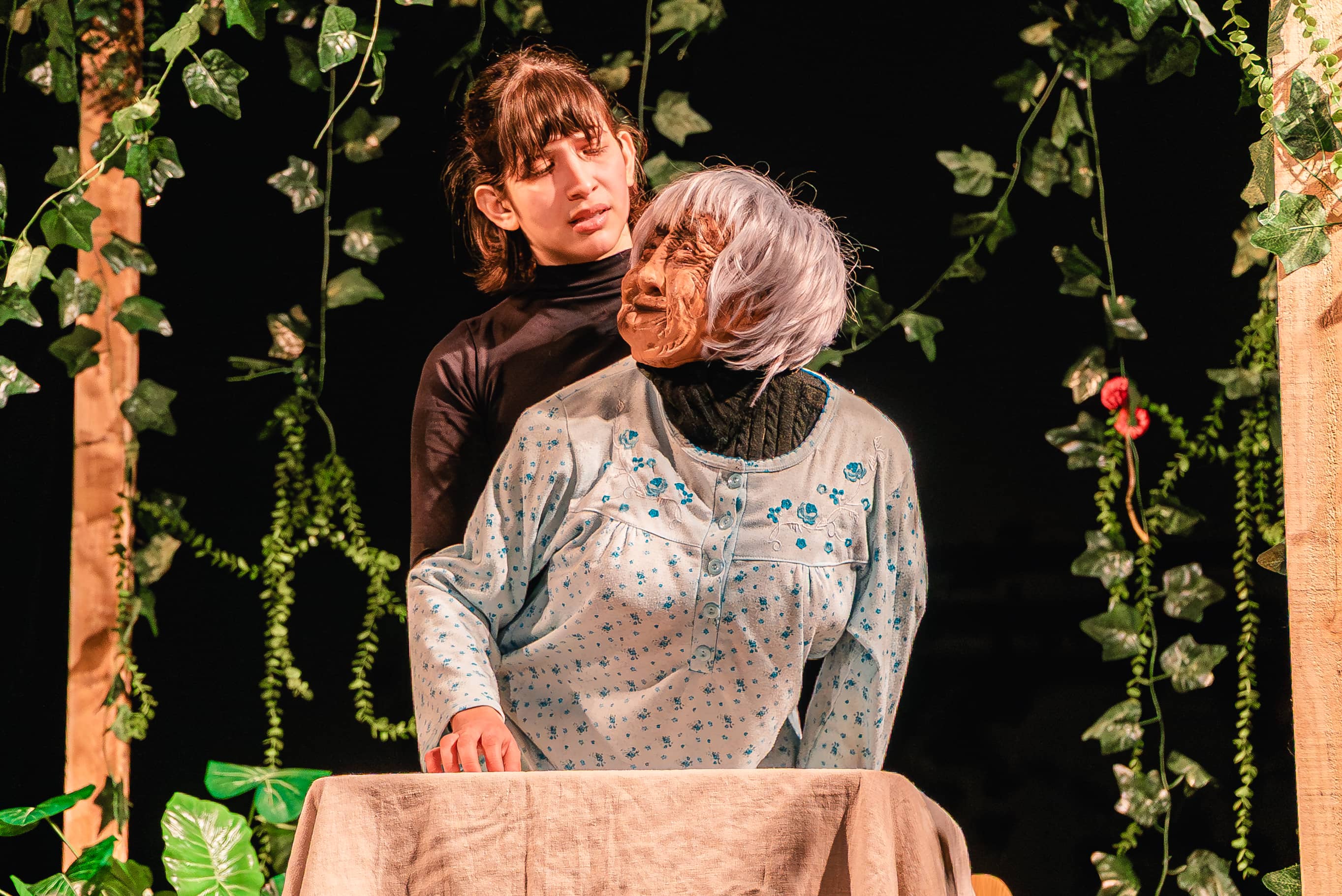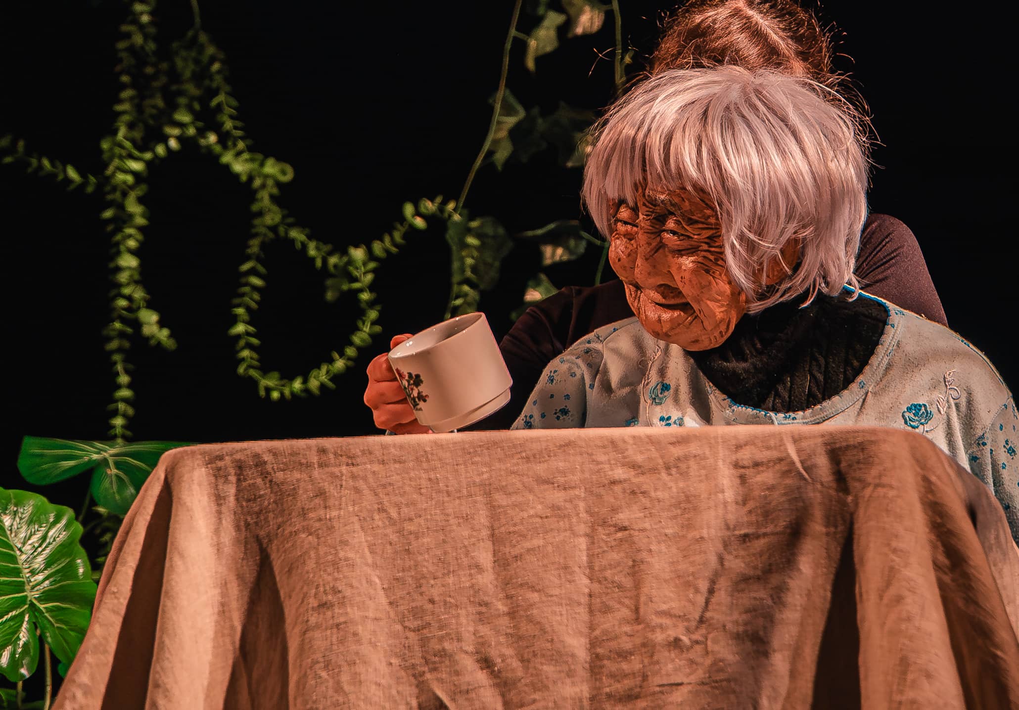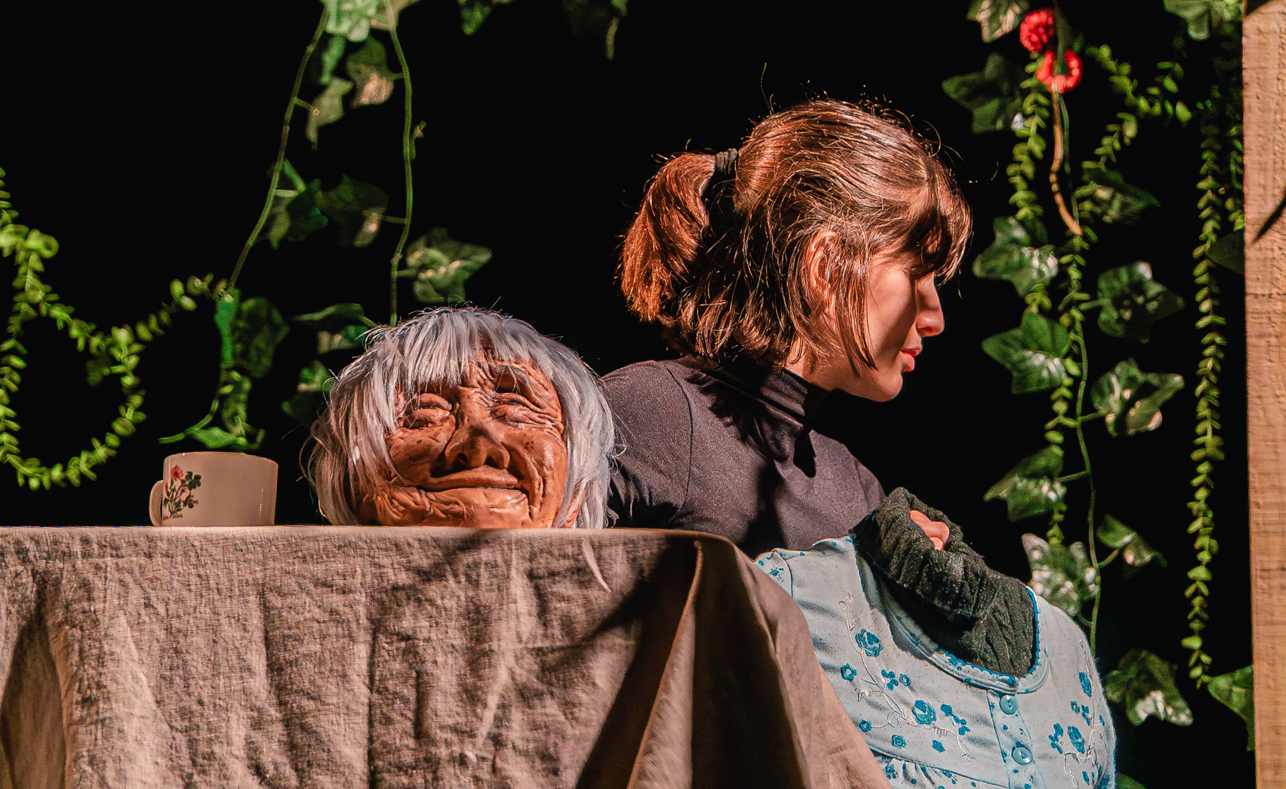 La puesta en escena destaca por una escenografía sencilla pero cuidadosamente elaborada. La obra cuenta con una sola actriz, quien interpreta a ambos personajes: la nieta y, mediante una marioneta, a la abuela. Este recurso escénico potencia la intimidad del relato y permite una conexión profunda con el público.