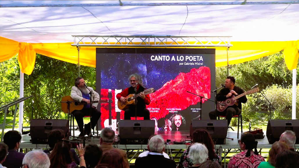 Posteriormente, estudiantes del Colegio Leonardo Da Vinci de Vicuña presentaron la obra Haiku para Gabriela, resultado de un proceso pedagógico y creativo que vincula poesía, contemplación y territorio, seleccionado para representar a Chile en la Exposición Universal Osaka 2025. La programación incluyó además una intervención de Canto a lo Poeta dedicada a Gabriela Mistral, a cargo de los cultores Álvaro Díaz Parada, Raúl “Talo” Pinto y Arturo Varela, junto con una declamación colectiva del Centro Cultural y Artístico Elquialmar de Vicuña. La tarde incorporó también la exhibición audiovisual Museo Gabriela Mistral de Vicuña: un año celebrando el Nobel, que dio cuenta del trabajo formativo, comunitario y expositivo desarrollado durante 2025 por la institución.