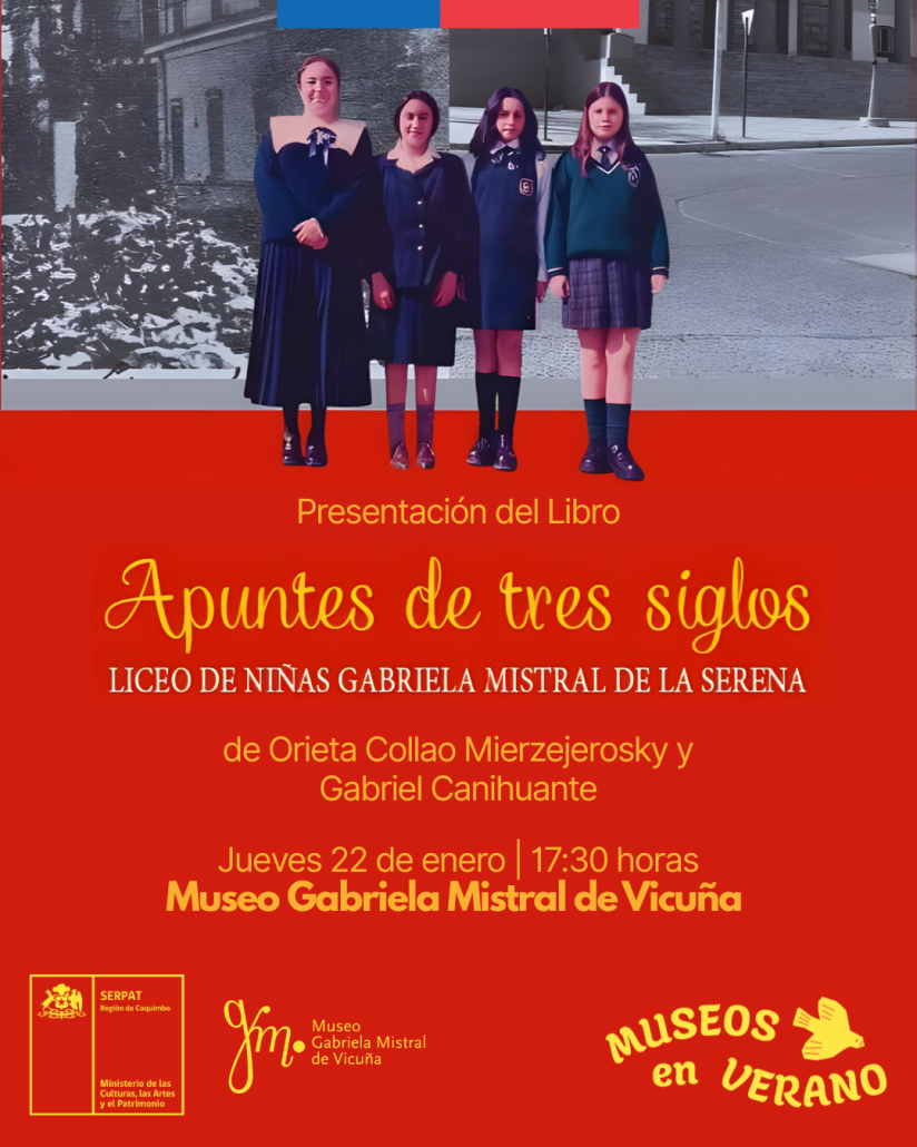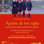 Museo Gabriela Mistral de Vicuña será sede, el jueves 22 de enero a las 17:30 horas, de la presentación del libro Apuntes de tres siglos: Liceo de Niñas Gabriela Mistral de La Serena, obra de los periodistas Orieta Collao Mierzejerosky y Gabriel Canihuante Maurerira, fruto de una investigación documental sostenida en material bibliográfico, fuentes institucionales y entrevistas en profundidad con ex alumnas, docentes y actores vinculados al establecimiento.